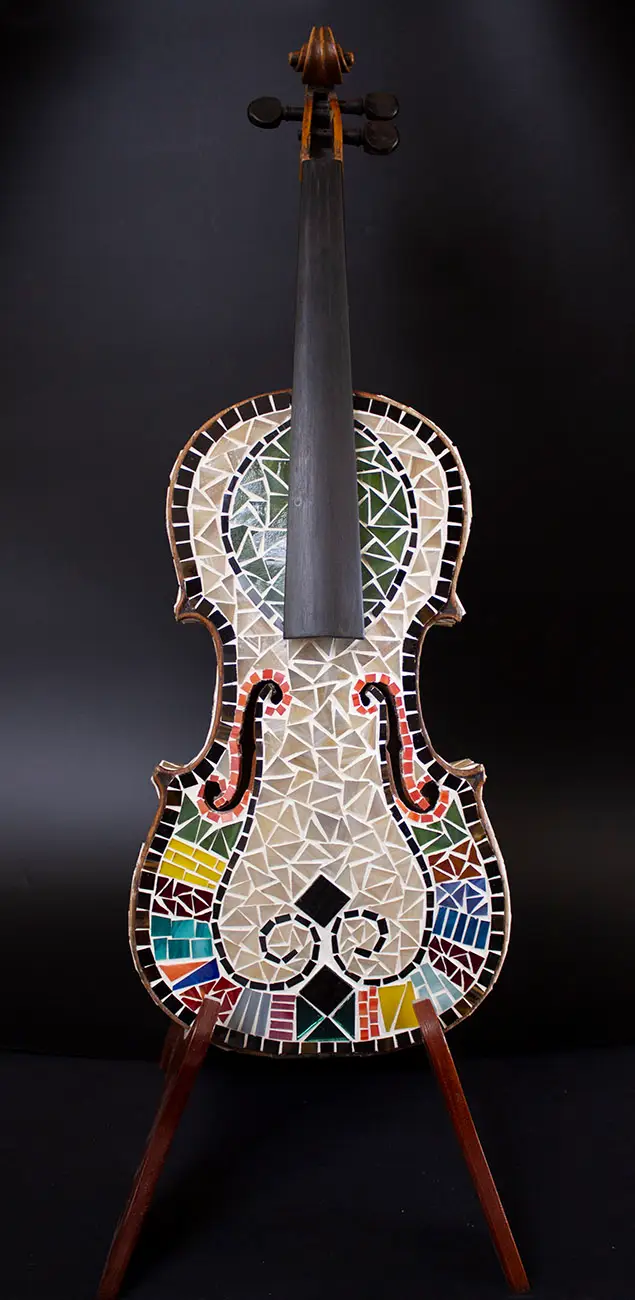 כינור – זכוכית על עץ. גודל 56*19 ס"מ.